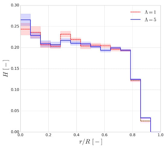 . The general shape of the distribution is similar to the range of employed haematocrit values. The shaded regions indicate the fluctuation of the profile and they are the standard deviations of the profile based on a 30 ms window time-averaging. It can be seen that the cytoplasmic viscosity contrast has an almost negligible effect on the shape of the distribution, and, interestingly, the size of the cell-free layer seems to be mostly unaffected as well.
