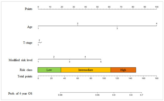 PCO nomogram. Age (years): 1 = under 59, 2 = 60–69, 3 = 70–79, and 4 = over 80; T-stage: 1 = T1 (T1b, T1c), 2 = T2a, 3 = T2b, and 4 = T2c-T3; Modified risk level: 1 = Gleason score ≤ 6 and PSA ≤ 10 ng/mL, 2 = Gleason score ≤ 6 and PSA > 10 and PSA ≤ 20, 3 = Gleason = 7 (3 + 4), 4 = Gleason = 7 (4 + 3), and 5 = Gleason score ≥ 8 or PSA > 20; Nomogram points: Low risk = 0–34, Intermediate risk = 35–115, High risk = 116–156, and Total scores = 0~156. Prob. = probability.