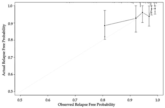 The classifier calibration was assessed by grouping patients by their PCO classifier score (Figure 2). The calibration of the PCO classifier application illustrates how its predictions compare with the actual outcomes for the 809 patients. The performance of the PCO classifier application was within 10% of the actual outcomes and more accurate at 90% predicted probability. The x-axis is the predicted value calculated using the PCO classifier application, and the y-axis is the actual freedom from BCR for the present patients [10,25]. The vertical bars represent 95% CI based on bootstrap analysis.