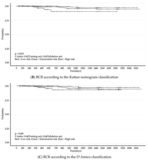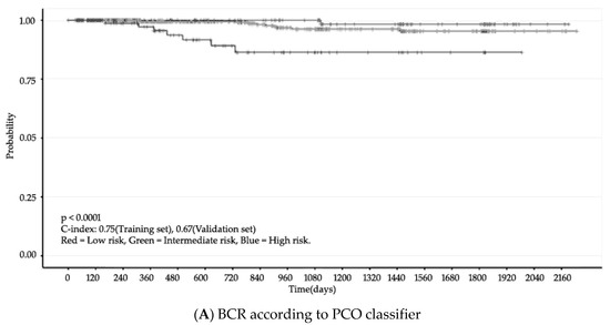 Finally, we validated the PCO classifier application in two steps. First, we used the c-index for accuracy, which indicates the discrimination ability of prediction models [26]. The accuracy of the PCO classifier application was also assessed with Harrell’s concordance. Next, we compared the PCO classifier and two other classifiers: Kattan nomogram and D’Amico (Figure 3). The c-index of the PCO classifier was 0.75 (training set) and 0.67 (validation set). The c-index of the Kattan nomogram classifier was 0.62 and 0.63, respectively, and the c-index of the D’Amico classification was 0.64 and 0.64, respectively (Table 4).