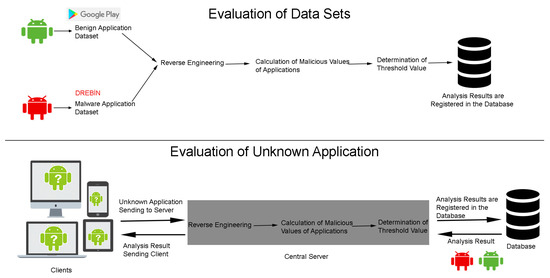 The use of mobile devices has been increasing in the world. Mobile device users can easily perform banking, shopping, web page navigation, gaming, and similar transactions without computers. According to first quarter report of International Data Corporation (IDC) Company of 2017, the global smartphone market has grown 3.4% and Android’s market share in the smartphone market has reached up to 85% [1]. According to the G Data H1/2016 report, worldwide use of the Android platform was determined to be 68% in the first half of 2016 [2]. Again, according to this report, 1,723,265 new malicious application examples were identified. Yet again, the amount of new malicious software is increasing, as well as the complexity of the malicious software introduced to prevent the detection of malicious software. Google Play Protect, announced at Google I/O 2017, runs embedded on Play Store and scans the applications before and after their installations [3,4].