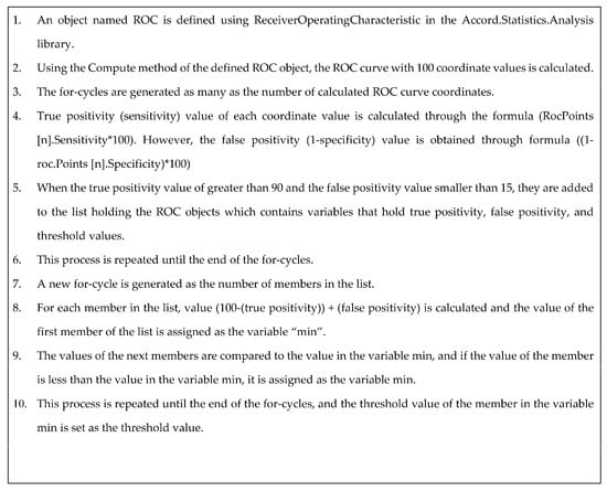 When Figure 2 is assessed, the area remaining under the curve represents an excellent test. If the area under the curve is 0.5, it represents a worthless test. In the fifth step, the applications were determined as being benign or malicious software based on this threshold value. The Accord.Statistics.Analysis [48] library was used to calculate the threshold value through the receiver operating characteristics curve. The algorithm of the piece of code used to determine the threshold value by using this library, as shown in Figure 3. A web-based client was developed for evaluating unknown Android applications. The server made by the Android application was subjected to some steps; namely, reverse engineering, computing of the malicious value of the application, and determining of the threshold value respectively. Then, the results of the analysis were saved in the database and sent to the client.