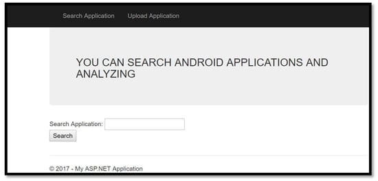 The developed Android malware detection system in this study runs according to the client-server architecture. Because the transactions are conducted on the server side, there is no load generated on the client side. On the client side, only the analysis result is shown. The most important reason for performing server-side operations is that Android phone clients have limited resources, such as battery, processor, and RAM. The capabilities of the developed web application include Google Play integration, Apktool, VirusTotal, web scraping for APKPure, apkleecher [49] and apkbucket [50]. The application search interface of the developed web application is presented in Figure 4.