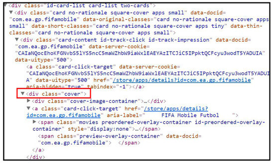 When Figure 5 is analyzed, the line marked with red is the section where the application information is located. The mouse is right-clicked on this marked section, then the Copy path is clicked, and finally the XPath is obtained by selecting Copy XPath. Using the obtained XPath, the image, package name, and application name information that the applications have will be obtained. With the Search Applications option, Android applications can be searched for by application name, application package name, or any desired words. In Figure 6, a search result based on the word football is shown.