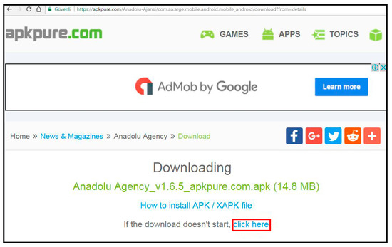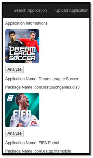 When Figure 6 is analyzed, the results are listed based on the searched word “football”. Analyses were conducted by selecting the chosen applications from the list. If the application has already been analyzed, the result is shown on the client side. If there was no analysis made earlier, the application must be downloaded first to the server. For downloading, the application is downloaded from the APKPure site first. A link such as “https://apkpure.com/Upload Name /package name/download? from=details” is created for this process. The most important thing to note here is whether there is a special character in the application name. Special characters in application names need to be replaced with a hyphen “-” character. This link is used for web scraping on the relevant site. “// * [@ id=\” download_link \”]” XPath is used for web scraping. This link should result in the “click here” link, as shown in Figure 7, on the resulting web page.