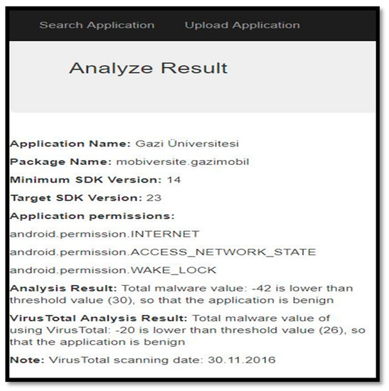 Examining Figure 8, the result of the analysis shows the name of the application, the package name, the version of Android it runs on, the permissions it requests, and two analysis results. The calculation method used by the first analysis result in the evaluation based on the permissions found in the benign and malicious data sets. The calculation method used by the second analysis result, however, is the calculation that VirusTotal has added to the calculation used in the first analysis method. Furthermore, the user is provided with the date information of the scan made on VirusTotal.