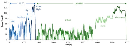 A Worldwide harmonized Light vehicle Test Cycle (WLTC) Class 3 divided in four phases (low, medium, high, and extra high), and a pre-recorded real driving emissions (RDE) cycle under laboratory conditions (lab-RDE) cycle divided in three phases (urban, rural, and motorway).