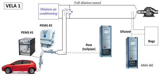 One analyzer (AMA i60 from AVL) was used to measure the diluted gas in real time (lab-RDE) or the bags filled with diluted exhaust at the end of the test (WLTC). The bag and/or diluted measurements were considered as the reference values. Another analyzer (AMA i60) was used to measure the raw exhaust from the tailpipe of the vehicle, after the two PEMS (technical specifications in Table 2).