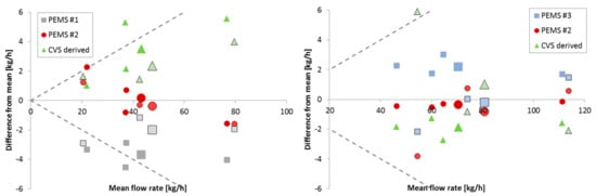As a reference, the mean (average) of the three measurement systems (PEMS and CVS derived) was chosen because none of the methods can be considered as a reference method with low uncertainty. The differences were within ±4 kg/h (few exceptions), which translated to a deviation of around ±10% of their mean value for low mean flow rates (<40 kg/h), and a lower than ±5% deviation for higher flow rates. PEMS #2, which was used with both of the vehicles presented consistent behavior (differences were around zero), while the CVS derived flow was slightly overestimating (1–5 kg/h) for the SI vehicle and underestimating (2–3 kg/h) for the CI vehicle. The authors were not aware of any studies comparing exhaust flow measurements, other than the 2017 margins review study [], where, in most cases, the differences were within ±10%.