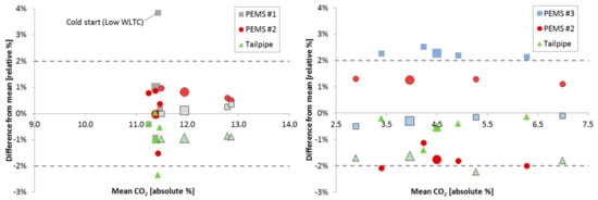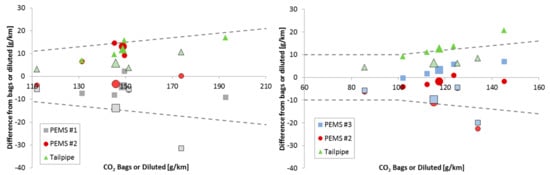 Figure 9 presents the differences of the PEMS and the tailpipe analyzers to the dilution tunnel results for each phase of the WLTC (smaller symbols without frame) or the lab-RDE cycles (smaller symbols with frame) for the two vehicles. The larger symbols are the overall cycle results. The dashed lines show permissible tolerance according to regulation []. Each point is the mean value of three repetitions.