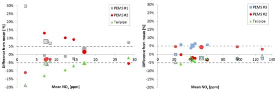 Figure 7 presents the differences between the NOx analyzers measuring at the tailpipe of the vehicle. As all of the analyzers had similar specifications, their mean value was considered as the reference. For the SI vehicle, the mean measured NOx concentrations were <30 ppm, while for the CI vehicle, they were between 20 and 140 ppm. The differences of the instruments were within 5% for the CI vehicle, but up to 30% for the SI vehicle. The 5% uncertainty is in agreement with the estimated uncertainty of the current analyzers []. The higher uncertainty at the low range is also in line with the higher uncertainty of the analyzers at low concentration ranges that approach their zero levels [], and a study that compared NOx analyzers (10%) []. NOx analyzers are typically calibrated from 2000 ppm down to 100 ppm. A limited number of data showed that below 100 ppm, the uncertainty increases from 2% to around 5–10% at 10 ppm []. These results confirm that current PEMS have a high level of variation at low NOx levels; thus, for low NOx emission levels, the measurement uncertainty (margin in percentage) is higher than what is currently prescribed. Alternatively, for keeping a similar margin, PEMS need to reduce the uncertainty at low levels.
