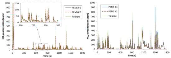 Figure 8 presents an example of the time aligned NOx data of the analyzers. The signals were almost indistinguishable from each other. Although PEMS #1 was tested with low concentrations in general, the few spikes with high concentrations (Figure 8, left panel) were at the same levels as the rest systems, indicating that the good results of Figure 7 (left panel) would also be valid at higher concentrations.