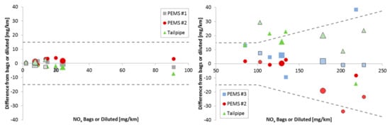 NOx emission differences of PEMS and tailpipe analyzers from bags (WLTC) or dilution tunnel (lab-RDE). Left panel: SI vehicle. Right panel: CI vehicle. The dashed lines show permissible tolerance according to the regulation [].