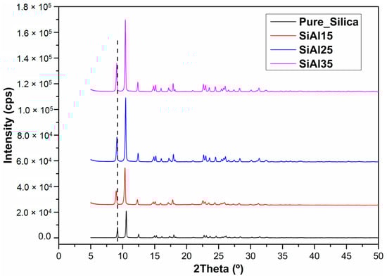 The difference in the intensities of the same peak positions, among the samples, was another interesting observation from the X-ray diffractograms. These intensity values were normalized to create the average relative crystallinity index, with the number one assigned to the highest intensity of the four peaks at the same 2θ range. To obtain the average, the peak intensities were measured in the following 2θ ranges, 10.3–10.5°, 12.3–13.5°, 16.6–16.3°, and 24.1–24.8°. The results are shown in Table 2. Comparing the aluminosilicate samples, a lower quantity of aluminum in the synthesis helped to obtain a higher average crystallinity index. Surprisingly, the Pure_Silica sample showed the opposite behavior, probably because the presence of aluminum influenced its nucleation and the growth procedure was accelerating it. These results do not mean that the samples are amorphous; this is just a comparison among them as previously reported in the literature [].