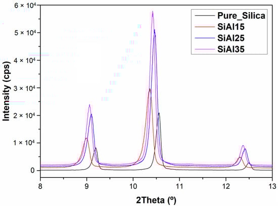 It is possible to compare the peak positions of the samples as an indication of the incorporation of a heteroatom in the framework []. The substitution of an atom by a different atom in the unit cell results in a distortion of the cell parameters, owing to its different characteristics (e.g., volume, charge). Since the Bragg reflections of an X-ray diffractogram correspond to the different planes and atomic positions, a slight change in these positions, or atomic substitutions, will be reflected in the displacement of the 2θ values of the peaks. In this case, we are studying the incorporation of aluminum, so a shift to lower 2θ values, relative to those of the pure silica samples, indicates that aluminum was effectively incorporated into the framework. Figure 3 shows the 2θ region between 8° and 13°, confirming that this displacement did occur in the three samples when Al was added, possibly suggesting that the aluminum entered the zeolitic framework. As expected, the SiAl15 sample with the highest quantity of Al added showed the largest shift in the diffractogram. Nevertheless, this observation still needs to be confirmed by other techniques because it is difficult to quantify the Si/AlTETRA ratio with the X-ray diffractograms alone.