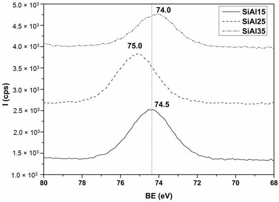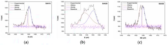 where KE(AlKLL) is the kinetic energy of the Auger electron at AlKLL (Figure 6), and KE(Al 2p) is the kinetic energy of the Al 2p photoelectron. A comparison of these results with the results of 27Al MAS NMR shows that, for SiAl25 and SiAl35, it is similarly indicated that the tetrahedral aluminum would be easily accessible as acidic sites. In the case of SiAl15, the octahedral aluminum content may interfere with the accessibility of the tetrahedral aluminum in future reactions. Despite the increasing ratio from SiAl15 to SiAl35, the results were as expected. The octahedral aluminum was outside of the framework; it was placed on the surface. The data obtained from the XPS analysis are summarized in Table 3 and Table 4.