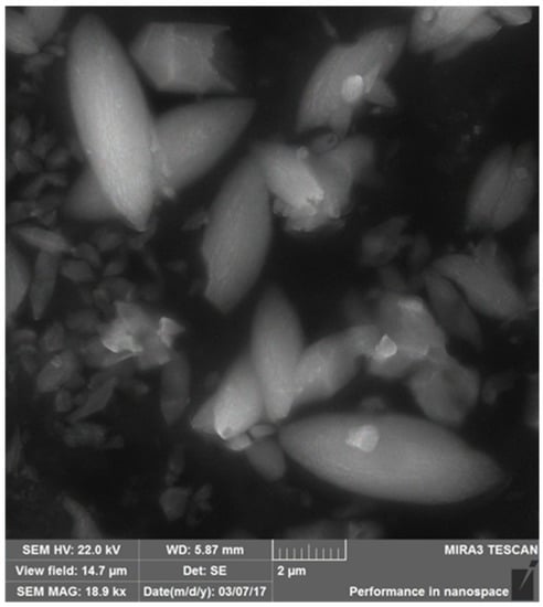 The SiAl25 sample was observed using field emission gun scanning electron microscopy (FEG-SEM), the obtained micrograph is shown in Figure 7, and the Suplementary Material in Figure S2. The resulting morphology is similar to a rice grain, which has the same reported morphology for the pure silica HPM-1 [].