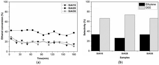 - Phung, T.K.; Busca, G. Ethanol dehydration on silica-aluminas: Active sites and ethylene/diethyl ether selectivities. Catal. Commun. 2015, 68, 110–115. [Google Scholar] [CrossRef]