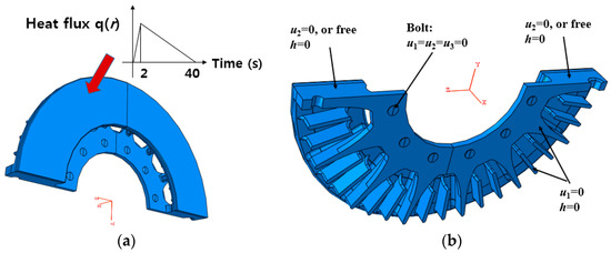 The displacement boundary conditions are shown in Figure 3. Fixed or free displacement boundary conditions were given on the two side faces of the disc (). Mounting bolts were modeled as solid bars, and the bottoms of the bars were fixed. A frictionless condition was applied to the contact face between the bars and the bolt holes of the disc.