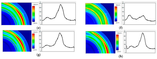 Infrared images of stop braking and a temperature profile along a radial line. (a) 4.805 s after brake application, (b) 6.940 s, (c) 7.341 s, (d) 8.809 s, (e) 33.634 s, (f) 34.835 s, (g) 35.502 s, (h) 36.303 s.