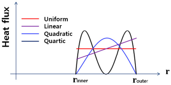 To investigate the relation between heat flux and temperature distribution in the radial direction, four types of heat flux (Figure 5) were applied on the frictional surface of the brake disc: (1) uniform distribution in the radial direction; (2) linearly increasing heat flux, which means uniform pressure in the radial direction, if the friction coefficient, μ is constant at every instant; (3) quadratic distribution; (4) quartic distribution. The total amount of heat input on the contact surface was the same for all cases.