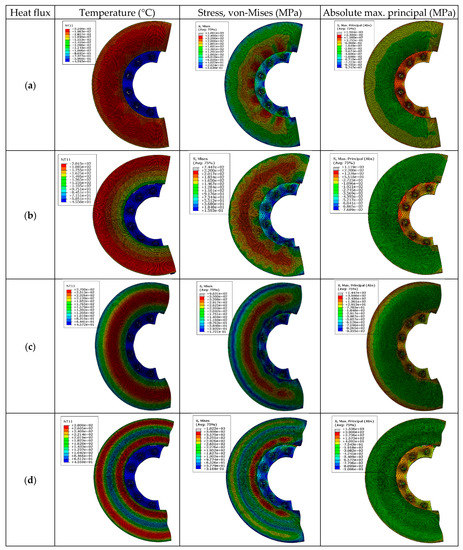 Thermal and stress fields at t = 16.26 s after brake application. (a) Uniform, (b) Linear, (c) Quadratic, (d) Quartic.
