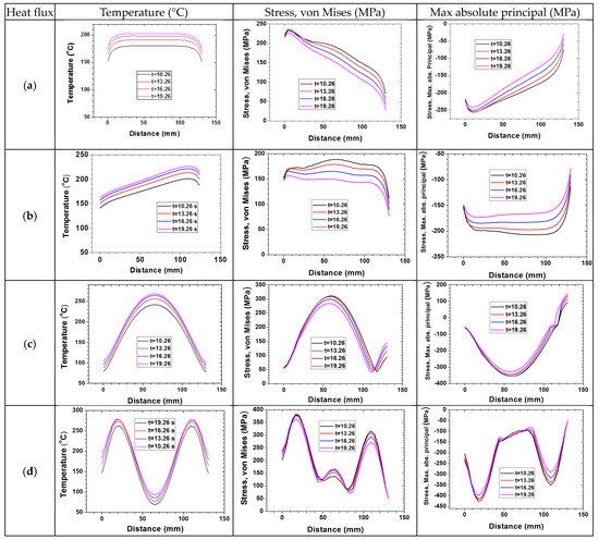 Maximum temperatures, positions and stresses for four types of heat fluxes at t = 16.26 s.