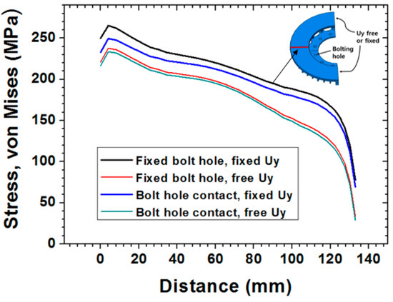 Figure 8 shows the effect of boundary conditions on the stress along the symmetric line on the surface of the disc. r = 0 and r = 135 are the inner and outer radii of the frictional surface of the disc, respectively. Compared to the fixed bolt hole and fixed , the free condition on the sides of the disc lowered the maximum von Mises stress by 27.5 MPa (10.3%), and the bolt hole contact condition gave a 15.8 MPa (5.9%) lower von Mises stress. Applying conditions–where bolt hole contact and () were free, lowered the maximum von Mises stress by 31.8 MPa (11.9%). Therefore, in terms of thermal stress, a disc composed of two pieces seems to be more thermoresistant.