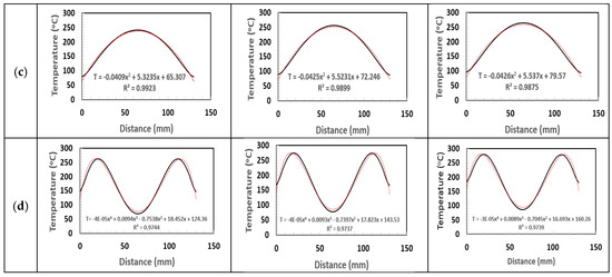 Curve fitting of temperature data obtained by finite element analysis. (a) Uniform, (b) Linear, (c) Quadratic, (d) Quartic.