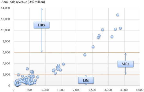 Obtaining the data required for desirable outputs (i.e., product sales revenue) and for inputs was much more challenging, because there is a lack of existing databases. To overcome this problem, a search of relevant data for stock market and Over-the-Counter (OTC) listed companies available from Taiwan’s Market Observation Post System [36] was taken as the starting point; in addition, financial data for individual firms were collected for consecutive years, so as to provide the data needed for the desirable output and input variables. The main problem for firms’ financial data is that the data included in the EPA database are structured by factory, not by company; to ensure consistency with the company-based financial data, the data for different factories belonging to the same company were added together. Following this data processing, the empirical data comprised data for nine semiconductor firms, with a total of 81 observations covering the period 2002–2010. To remove the impact of price fluctuations, data expressed in monetary terms were deflated using 2010 as the base year. Three groups were categorized according to the net sales revenue level. These groups are divided into high-revenue DMUs (HRs), middle-revenue DMUs (MRs), and low-revenue DMUs (LRs), according to the annual net sale revenue of US$6001 million and above, US$2001~6000 million, and US$2000 million and below, respectively. A summary of the basic statistical results obtained is shown in Table 1 below and the scatter diagram shown as Figure 2.