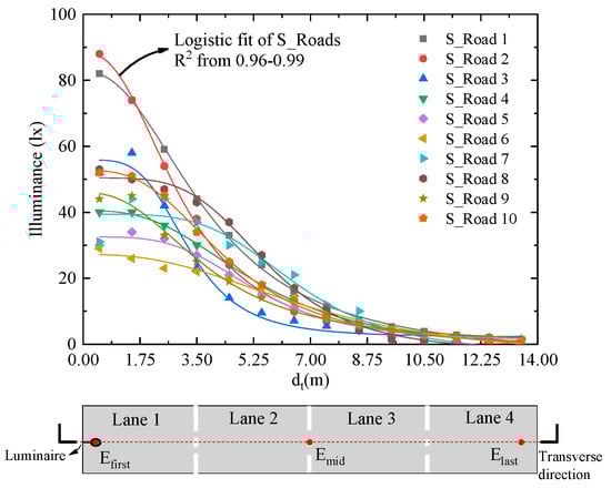 3.2. Illuminance Distributions and Modelling in the Transverse Direction