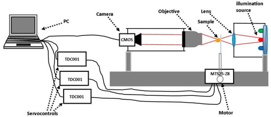 In Figure 1, we can see the set-up of the experimental device. This consisted of a BF horizontal microscope with a 16 bit monochrome Complementary Metal-Oxide-Semiconductor (CMOS) camera with a pixel size of 5.5 µm × 5.5 µm, and an effective image chip size of 11.264 mm × 5.984 mm, presenting 2048 × 1088 pixels. The microscope enabled automated sequential acquisition of the BF images. The images were recorded by defocusing the sample slightly in the z-direction (optical axis) through a stepper motor MTS25-Z8. The motor was monitored in three directions (X, Y, Z) by three servocontrols. Therefore, we were able to scan the region of interest in the sample. The servocontrols were connected to the PC, which enables the control of the defocus distance Δz and the image acquisition protocol by using a MatLab operation code.