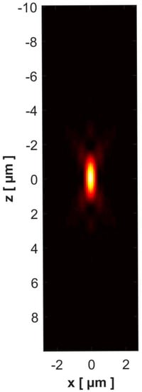 X–Z cross section of the computed point spread function (PSF) with the acquisition parameters of the experimental device: the numeric aperture of the dry objective with working ; the refractive index of specimen layer ; the standard value of refractive index of the air ; the refractive index of the air during the experimentation , ; the pixel size in the object space is 0.1 µm.