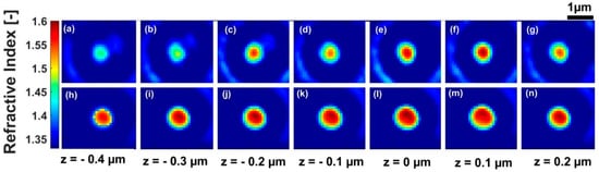 3D refractive index reconstruction at for a polystyrene microsphere with a diameter of , without PSF consideration (a–g), and with PSF consideration (h–n).