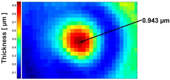 A reconstruction of the refractive index after the deconvolution of the corrected images by the use of the 3D-PSF is presented in Figure 4h–n. The sectioning effect was more greatly appreciated through the spatial distribution of refractive index. The circular outlines of the microsphere were well highlighted. The artefacts that were observed in the planes , , were removed. In each plane of the microsphere, the homogeneity of refractive index distribution was greatly improved and tended to cover all of the circular outline of the microsphere, mostly in the focal plane. Table 1 presented a comparison between the mean values of the microsphere’s refractive index in the presence of the diffraction, and in the absence of diffraction. A mean value of the refractive index for the microsphere was an average over all the points inside the microsphere that corresponded to a plane. Before the deconvolution (presence of diffraction), the mean value of the refractive index seemed to be a function of the z-position. We mainly observed a decrease of refractive index values while we moved away from the focal plane. This was due to the diffraction dependence along the optical axis, which becomes more significant as we moved away from the focal plane. From to , an increase occurred. This could explain an effect of the vibration which occurred during the measurement. This induced the sample to be shifted from a plane to another during the measurement. This was a drawback for the TIE method, which required the precise motion of the sample. After the deconvolution (taking into account 3D-PSF), the mean value of the refractive index was quasi-constant. The value in the focal plane where diffraction effects are greatly reduced was also in agreement with the refractive index of , which is the reference value [] at . In Figure 5, we can see the size’s map of the specimen. It was obtained by using Equation (12), taking as the mean value of microsphere’s refractive index in the focal plane and as the refractive index of the distilled water used in the sample preparation. The microsphere’s diameter as deduced from the map was . This value represents the intensity of the pixel in the middle of the microsphere (Figure 5). The graph for the mean values of the refractive index as a function of z-position also led to the recovery of the diameter of the microsphere. The diameter was defined by the full width at half maximum (FWHM) indicated in the graph by the double arrow (Figure 6). The diameter, which was deduced from the graph, is . These two diameter values were close to (the reference diameter of the microsphere used for the microscopic examination in this work), and they were in relative variation, between and .