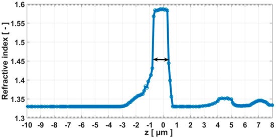 Mean values of the refractive index of the microsphere as a function of the z-position along the optical axis. The full width at half maximum (FWHM) indicated by the double arrow corresponds to the diameter of the microsphere.