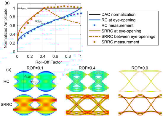 For RC signals, the amplitude of the eye-opening increases with the ROF. This value is marked as in Figure 1. The increase can be seen in simulations and measurements in blue in Figure 1a, as well as in the eye-diagrams for RC signals in Figure 1b. The reason for this is the decreasing swing in between the eye-openings. Since the waveform is normalized to this maximum value, this leads to an effective increase of the eye-opening. The dependence of the overshoot between two symbols for Nyquist filtering and the resulting restrictions were also discussed in Reference [].