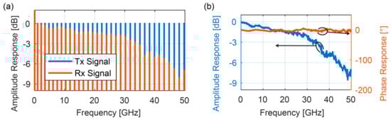 Figure 3a shows the amplitude spectrum of a measured frequency comb with 34 spectral lines (chosen as discussed above) for the digitally designed signal in blue and the measured signal in red. The small number of spectral lines was chosen for depictive reasons only. It was previously shown that more spectral lines give an improvement in final signal quality after application of the correction filter. The frequency and phase response, as plotted in Figure 3b, were determined as the difference of the transmitted and received signal for a frequency comb with 331 spectral lines. This measurement shows 3-dB and 6-dB bandwidths of 33 GHz and 44 GHz, respectively.