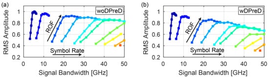 Three effects can be seen in the results. Firstly, the saturation for SRRC signals at a roll-off factor above 0.4, as described in Section 2, can be seen. Secondly, the influence of the DAC’s frequency response to the signals without DPreD can be seen in Figure 4a. That is why the measured RMS amplitude decreases for higher signal bandwidths. The slope of the amplitude decrease follows the evaluated response from Figure 3b. Thirdly, the difference between Figure 4a,b shows the influence of DPreD on the electrical eye-opening. In particular, for high symbol rates, there is a significant attenuation of the electrical eye-opening by DPreD upon comparing it to the case where no DPreD was used.
