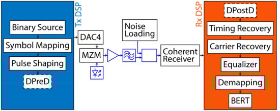 State-of-the-art optical transmitters circumvent the penalty of loss in the electrical signal due to predistortion by using electrical driver amplifiers. These amplifiers boost the electrical signal to allow a driving of the modulators in the range of Vπ. Preamplifiers give sufficient margin to apply a digital pre-distortion (DPreD). In fact, digital pre-distortion techniques are more and more deployed in commercial systems. Thus, for instance, a low-cost self-calibration routine to determine the frequency response including the in-phase and quadrature (IQ) skew [] was developed, and real-time transmission of 1 Tb/s with a 28-nm CMOS ASIC digitally compensating for up to 25 dB of loss in electrical-to-optical (EO) and optical-to-electrical (OE) conversion [] was shown. DPreD can also cancel, in part, the linear and non-linear distortions. The linear pre-distortion methods compensate for the low-pass characteristic of the transmitter, and therefore, eliminate the inter-symbol interference (ISI) of the signal [,,,,,,,]. Non-linear compensation methods can cancel the non-linear transfer function of driver amplifiers, digital-to-analog converters, and Mach–Zehnder modulators. In the case of a dominant non-linear influence on the signal, either Volterra series equalization [,,] or pattern-dependent look-up table-based corrections [,] were demonstrated to increase the system performance. Furthermore, the nonlinear Mach–Zehnder modulator transfer function can, for instance, also be linearized by inversion of the latter [,] or by the design of a special modulator [].