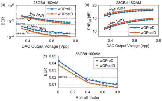 Figure 6a,b show the influence of the DAC output voltage on the bit error ratio (BER) and the effective SNR of a 28-GBd 16QAM signal. The BER was determined from the ratio of wrongly transmitted bits to the total number of transmitted bits. The DAC output swing could be chosen between 350 and 750 mVpp. We evaluated the performance in the low- and the high-SNR regime and show the results for DPreD in blue and DPostD in red. The SNR was adapted to the low- and high-SNR regime by optical noise loading. Due to the higher electrical signal power of signals with DPostD, there is an improvement in the low-SNR, as well as the high-SNR, regime when compared to DPreD. In both SNR regimes, there is an increase of 0.5 dB in effective SNR when changing from DPreD to DPostD. This corresponds to an increase of 12% in optical signal power.