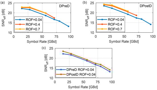To show the gain in overall signal quality due to DPostD, we measured, in a final step, the effective SNR for different symbol rates and ROFs, and compared the results of DPreD with the results of DPostD. Figure 7a shows the effective SNR for symbol rates of 14, 28, 56, 71, 80, and 96 GBd with roll-off factors of 0.04, 0.4, and 0.7 with DPreD as the compensation scheme. The possible symbol rate and roll-off factors are limited by the DAC sampling rate by , which explains the fewer measurement points for the ROFs of 0.4 and 0.7. Figure 7b shows the measurement results for compensation using DPostD. The trend follows the expected decrease of SNR for higher symbol rates. When increasing the symbol rate from 28 GBd to 56 GBd, there is a decrease in SNR of 3 dB, which is expected due to the fixed signal power, fixed noise spectral density, and the doubling of the signal bandwidth. In addition, it shows that the signal quality increases with ROF. However, when changing from 0.4 to 0.7, the increase is negligible, which follows the results of Section 2. Figure 7c shows the comparison of the measured effective SNR for DPreD to DPostD with a roll-off factor of 0.04. Over all measured symbol rates, there is an SNR gain of at least 0.5 dB, which shows the advantage of DPostD over DPreD for a wide range of symbol rates.