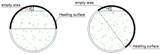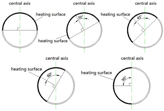Three CFST models were designed as shown in Table 3. Model 1, as a comparison, did not contain a void area, Model 2 was created with a 2.5 cm cavity, and Model 3 was created with a cavity height of 5.0 cm. The outer diameter of the steel tubes was 273 mm, and the wall thickness was 8 mm. The steel tubes were filled with C50 concrete. The outer surface of the steel pipe’s upper semicircle was the temperature load inlet, and the load form was set to the boundary of the constant heat flux. The heat flux was 800 W/m2. Based on the literature regarding the temperature field analysis of concrete-filled steel tube and the temperature detection data of some bridges, it was found that the arch rib’s temperature could reach above 50 °C under sunshine. This value could make the structure close to the actual temperature that the authors expected to reach after heating. The outer surface of the lower semicircle was set to the outlet. It could exchange heat with the outside and the heat transfer coefficient was 8.7 W/(m2·K). The two ends of the cylinder were defined as the adiabatic boundary without taking into account the influence of this part, because it was only a small section of the whole concrete-filled steel tube structure. There were three possible boundary contacts in the interior: the contact between steel tube and concrete, the contact between steel tube and air, and the contact between air and concrete. All boundary conditions were set to coupled wall. Convection heat transfer was carried out between them. Considering the influence of the heating position in the actual environment, the heating surface was rotated counterclockwise 30°, 45°, 60°, and 90° for the simulations. The specific location of the heating surface is shown in Figure 1.