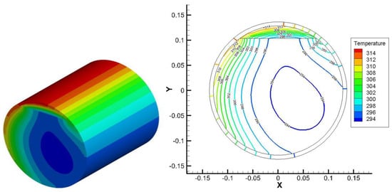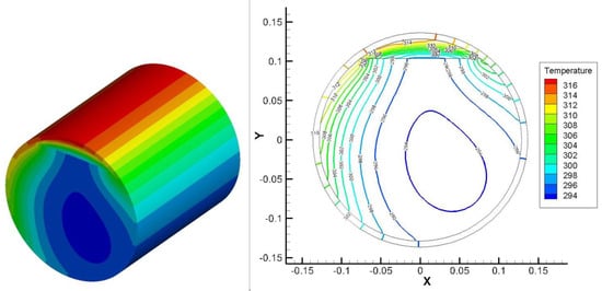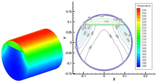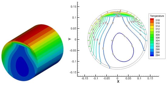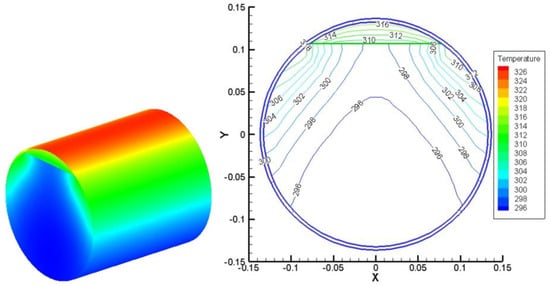 The temperature field of the solid section in Model 2 is illustrated in Figure 3. Unlike the solid Model 1, there was a sudden temperature change in the interface of the void. The isotherm was no longer like a circular arc. The maximum temperature at the top of the section was as high as 327.75 K, but the temperature at the bottom was only approximately 295.05 K, which was almost identical to that in Model 1. Because of the void’s existence, the maximum temperature at the top of the model had significantly increased. The highest temperature difference was 16 K higher than in Model 1, and the lowest temperature rose by nearly 0.1 K.