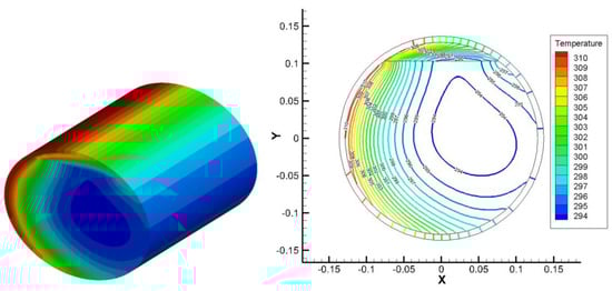 As shown in Figure 2, the temperature of the section in Model 1 was a ladder-like distribution according to heating position and sectional form. The temperature isograms distributed more densely when the position was closer to the heating surface, and more sparsely when it was far away from the heating surface. The isotherm behaved like a circular arc protruding toward the heating surface. The temperature of the section decreased along the circular arc. The highest temperature at the top of the model was approximately 311.75 K, whereas the lowest temperature was 294.95 K at the bottom of the model.