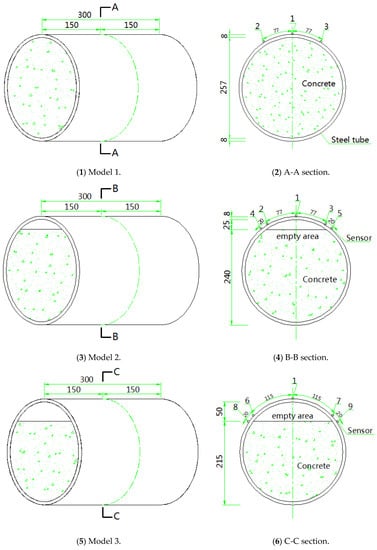 The size of the specimens was the same as the experimental models shown in Table 3. In addition, the numbering of the specimens corresponded to a pairwise comparison of the models (e.g., Specimen 1 corresponded to Model 1). An expansion agent was added to the concrete to ensure its tightness. As shown in Figure 9, temperature sensors were placed around the middle of the CFRTs, which reduced the influence of axial external media. Point 1 was arranged at the same position of the three models to compare the effect of the temperature on specimens with a different cavity height. Points 2 and 3 were arranged at the same position of Models 1 and 2 to compare differences in the temperature distribution between the void and solid specimens. In order to study how to identify the void area accurately, measuring points were arranged at both sides of the boundary’s separation region. Considering the heating direction’s influence, two heating modes were investigated for Specimen 2, as shown in Figure 10.