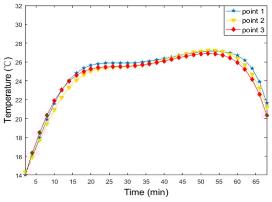 Affected by the height of the void, the temperature of point 1 was the highest and the temperature increase rate was the fastest. When the temperature reached 26.8 °C, the temperature increase rate decreased and slowly rose to the highest temperature of 28.1 °C. The temperature dropped to approximately 23.3 °C in 15 min during the cooling stage. The temperature distribution of points 2 and 3 were approximately equal due to symmetry. Their temperature increase rates were slightly lower than Point 1 and started to slow down at the temperature of 26 °C. The maximum temperature was 27.4 °C. It then dropped to 22.7 °C in 15 min after heating.