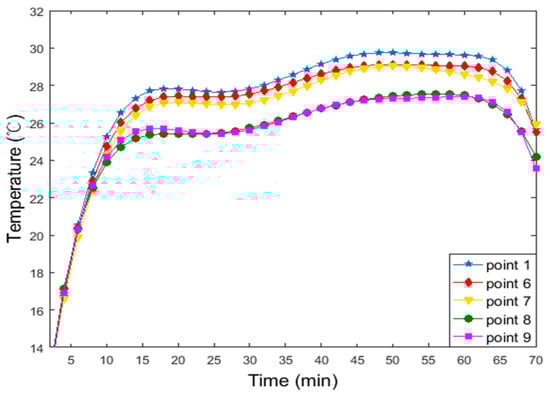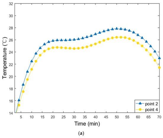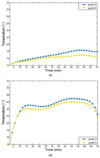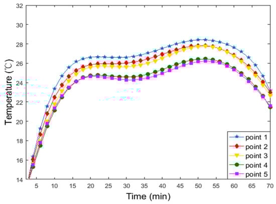 The temperature increase rates of points 4 and 5 were the lowest, and slowly rose to 26 °C after reaching the temperature of 24.5 °C. When heating was stopped, the temperature dropped to 21.6 °C.