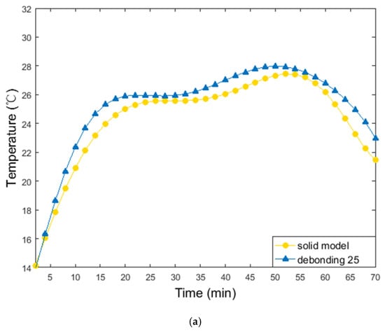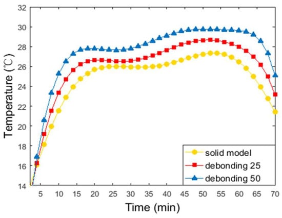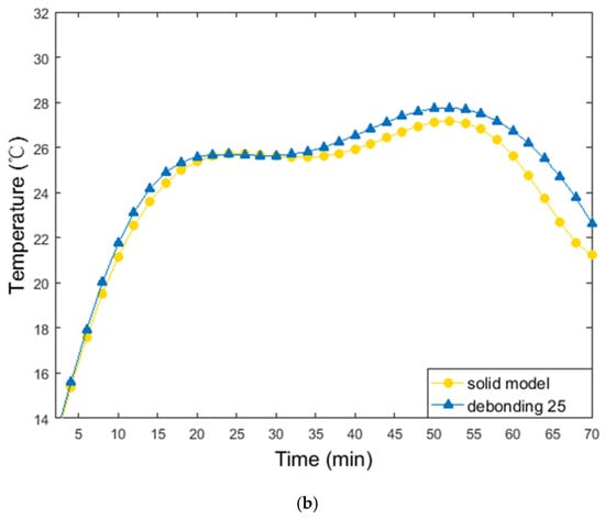 The temperature distribution of the void interface on both sides is shown in Figure 18. The temperature at points 2 and 3 located in the void part was higher than that at points 4 and 5 in the solid part. The difference was negligible at the beginning; however, it became significant with an average of 1.8 °C when the temperature reached approximately 24 °C. The mean temperature difference was approximately 1 °C during the cooling stage.