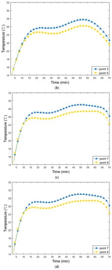 The temperature distribution of Specimen 3 is shown in Figure 14. At the maximum height of the void, the temperature of point 1 was the highest. It rapidly rose up to 28 °C through heating and then slowly increased to 30 °C. Because of the void’s wide range, the specimen accumulated a large amount of heat and Point 1 still maintained a high temperature for 6–7 min during the cooling stage. After 15 min, the temperature dropped to 26 °C. The temperature of points 6 and 7 were slightly lower than point 1, and the highest temperature was 29.2 °C. The position of minimum temperature was found in points 8 and 9. Heating up to 25.6 °C, the rate began to slow down and the maximum temperature could only reach 27.1 °C. The difference in temperature between the solid and the void areas was evident from this figure. The average temperature variation was more than 2 °C.